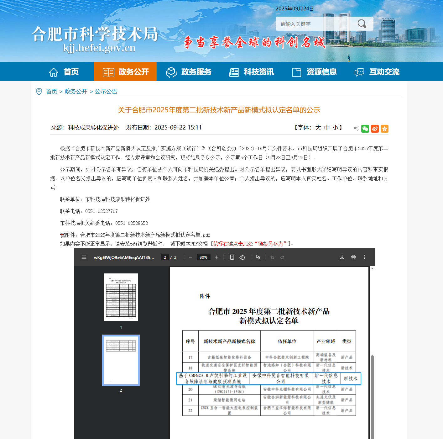 近日,合肥市科技局正式公布了2025年度第二批新技术新产品新模式认定名单。经专家多轮严格评审与筛选,我司自主研发的“基于CMFMC3.0声纹引擎的工业设备故障诊断与健康预测系统”凭借其在声纹监测领域的技术创新性与广阔的应用前景,成功脱颖而出,荣获官方权威认定。
